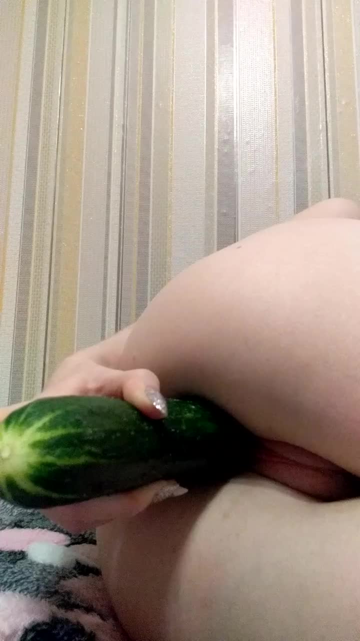 Слишком крупный огурчик она выбрала для своей похотливой выбритой пиздёнки!