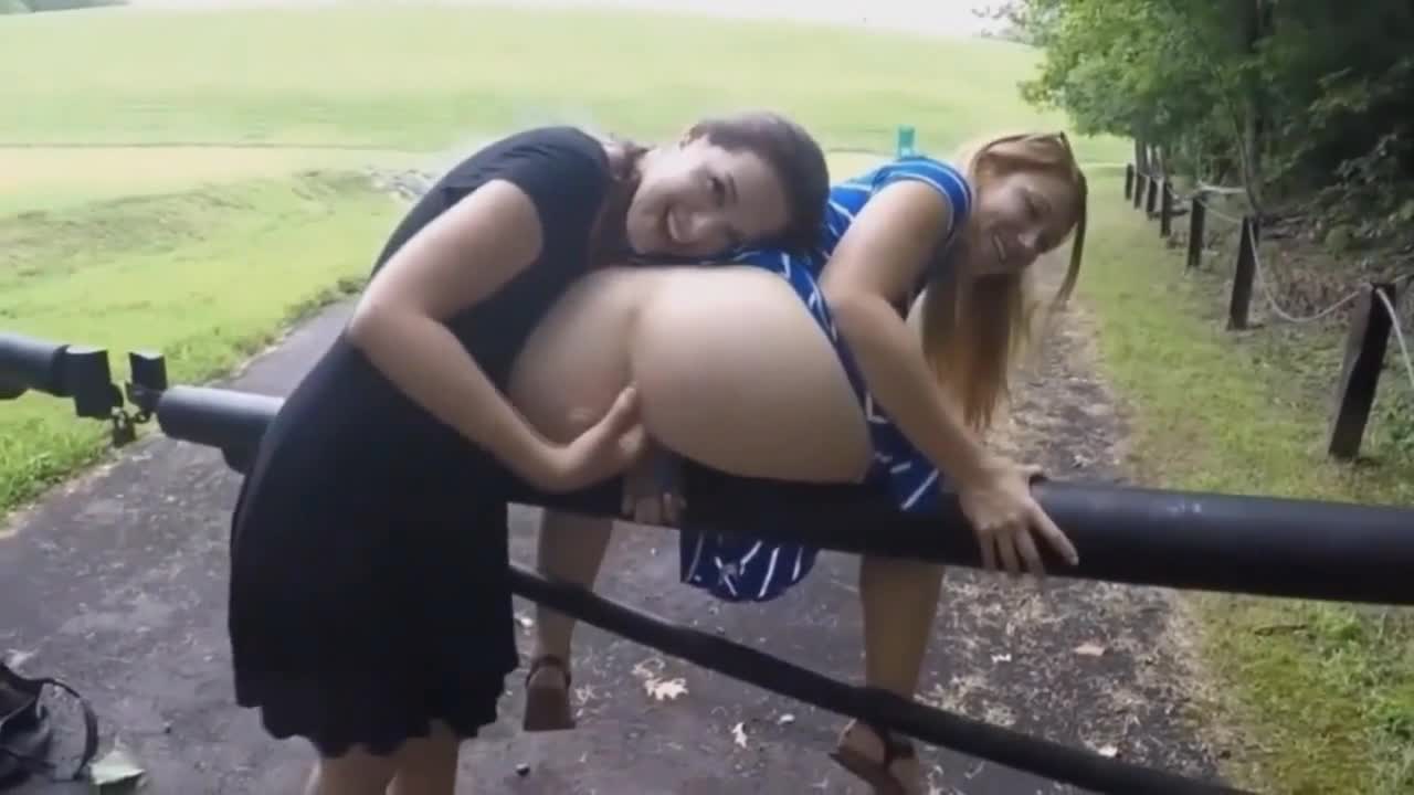 девушка трахает двумя пальцами свою подругу в пизду на заборе, рядом с дорогой.
