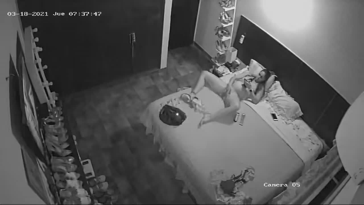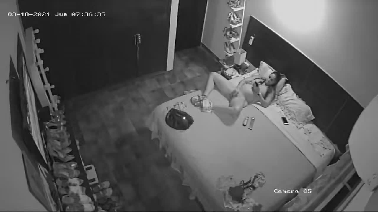 Кайфует самка на кровати мастурбируя под порно!