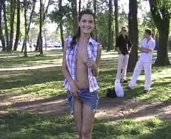 Деваха гуляет по парку и каждому мужику показывает свои молодые упругие сиськи и голую пизду, сильно возбуждаясь от этого.