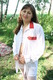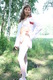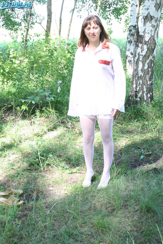 Неплохо смотрится в лесу рыженькая дамочка позирующая в белом прикиде!