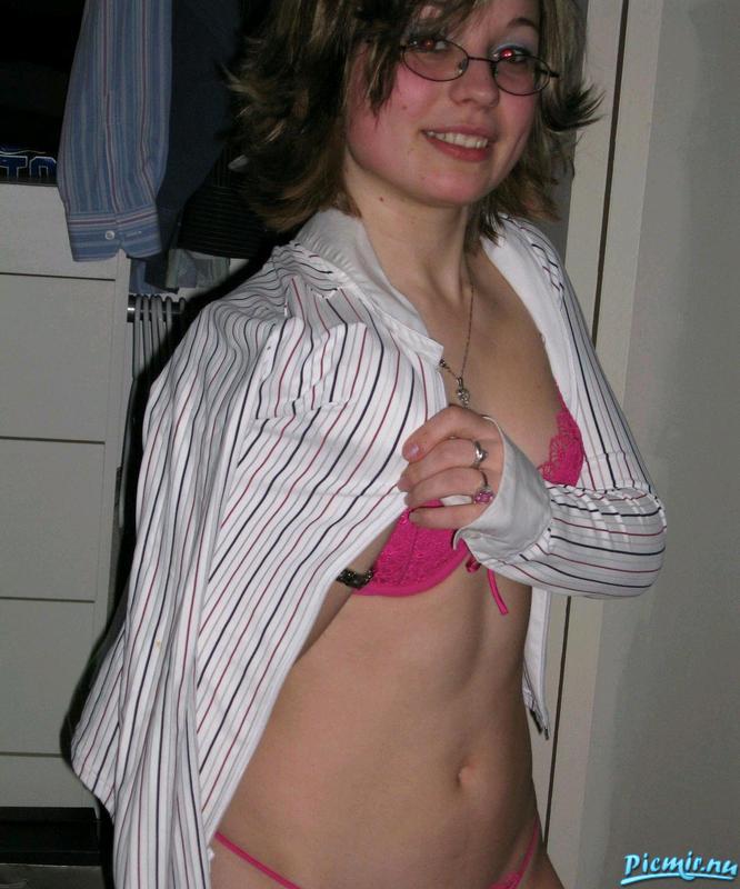 дома в нижнем белье красного цвета очки ей придают солидность
