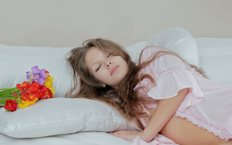 Очаровательно юная красотка с цветами обнажённой позирует в своём белоснежном будуаре!