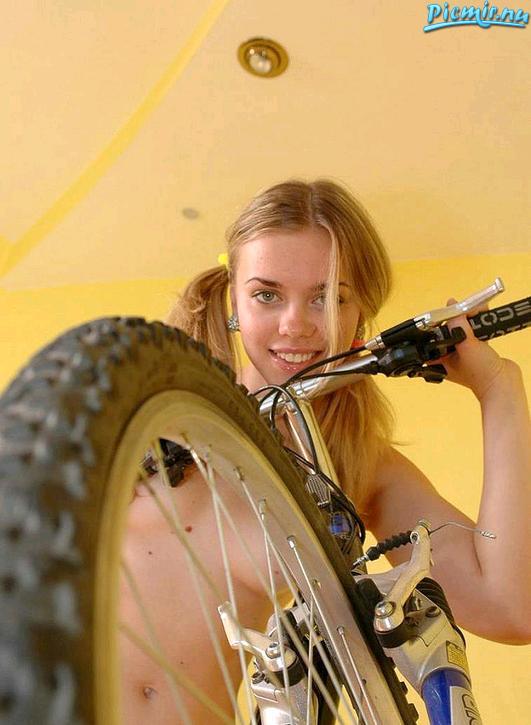 Классный велосипед! Только девочка с ним обращаться совсем не умеет, зато позирует классно! Очень аппетитная крошка!