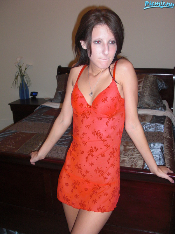 Девушка в красном на кровати делает минет