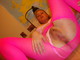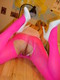 Девушка раздвинула ножки для фотосесии, надев розовые колготки