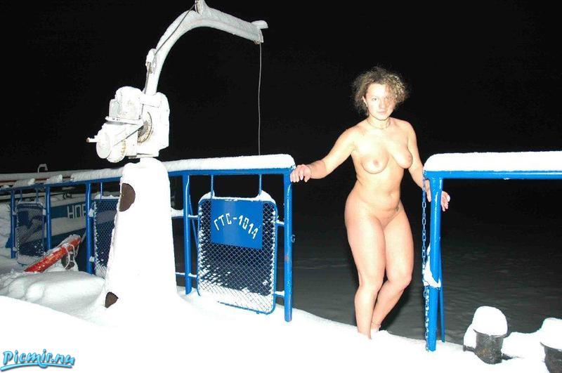 Горячая русская девушка гуляет голышом по заснеженному кораблю
