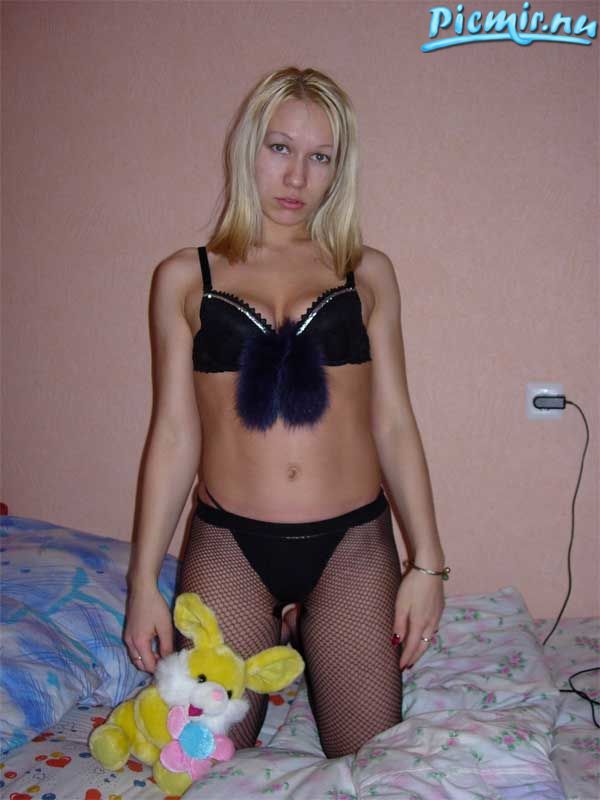 Блондинистая девочка позирует в белье и без него а так же насаживается на член своего друга.