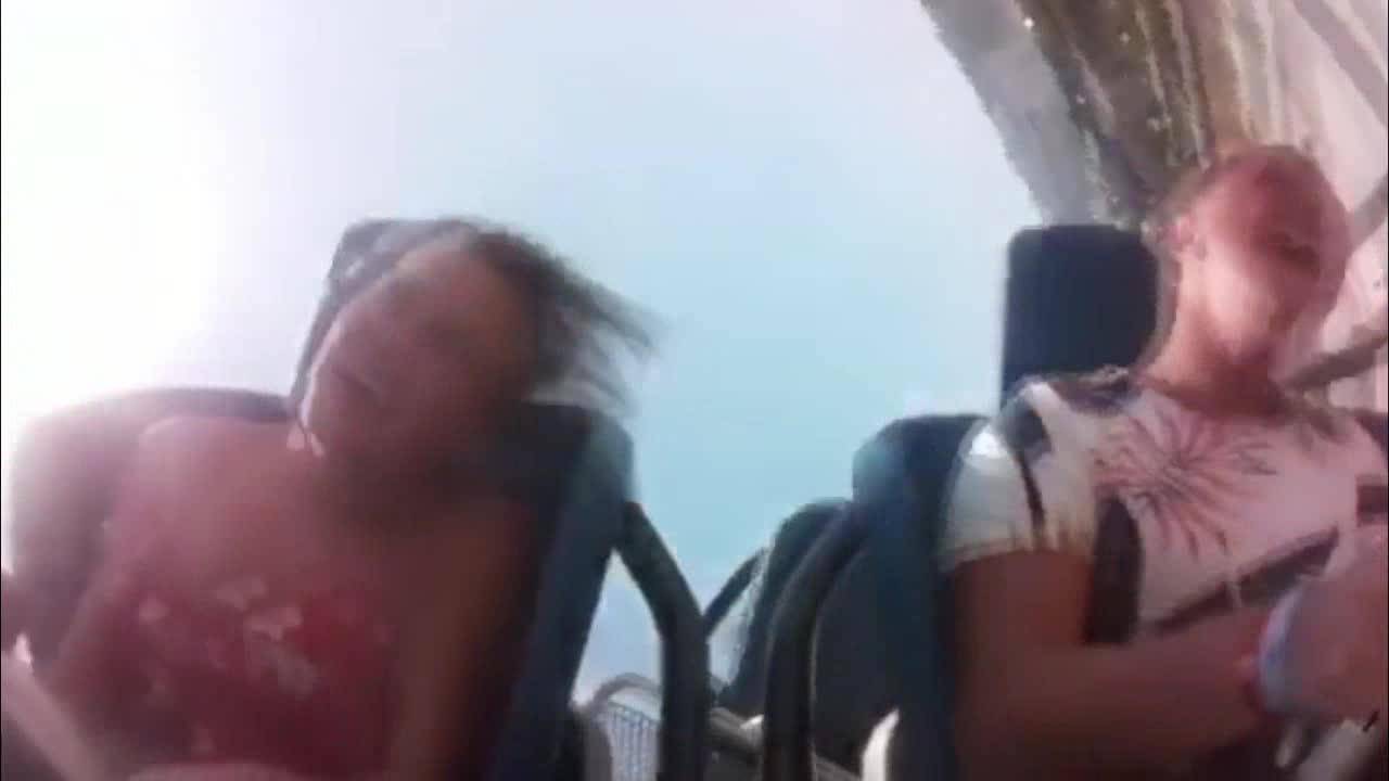 Сиськи у девушку вышла из платья, пока она катается на аттракционе в луна-парке и это развлекает ее.