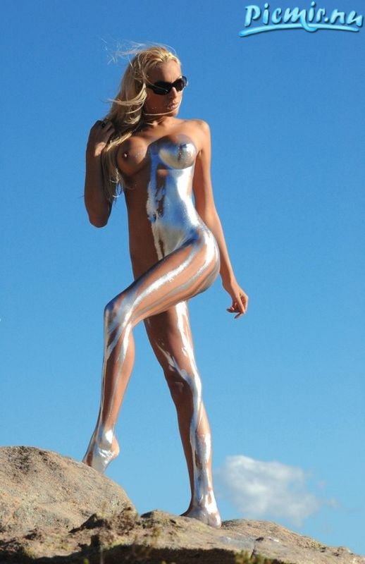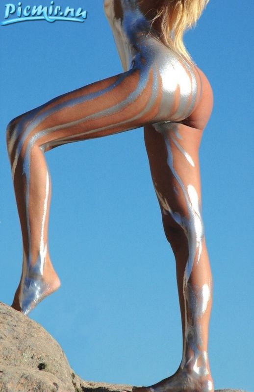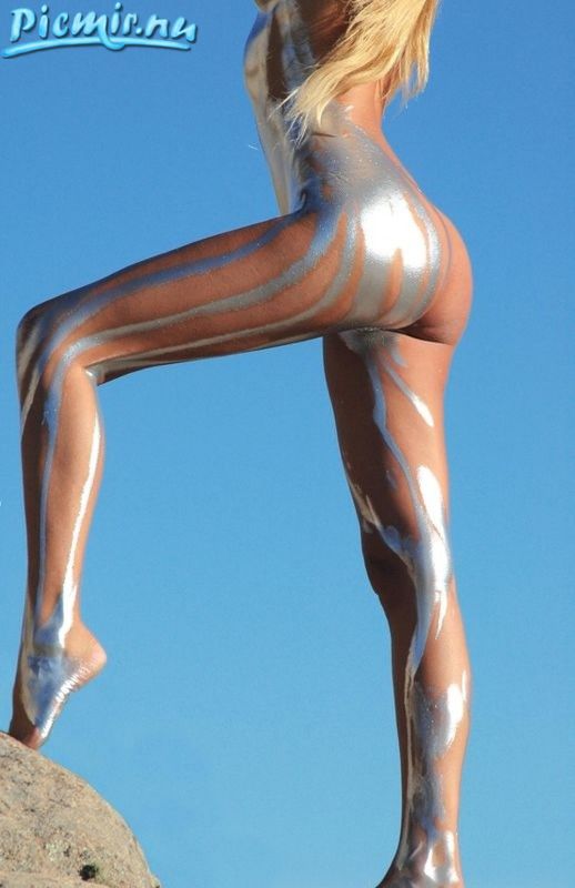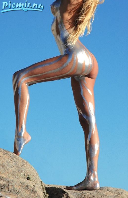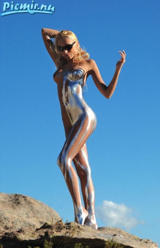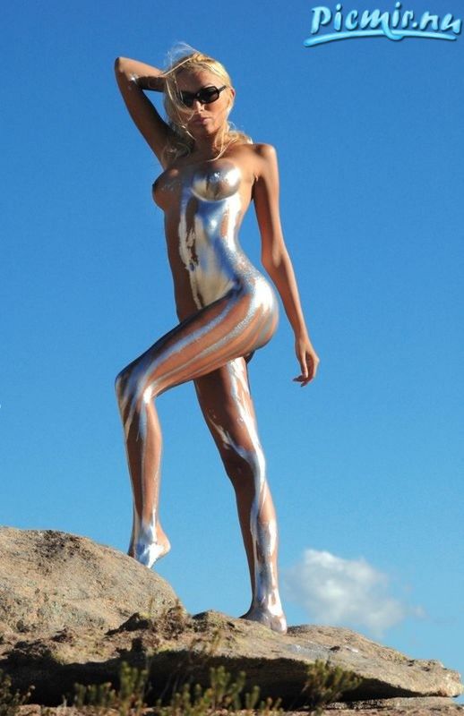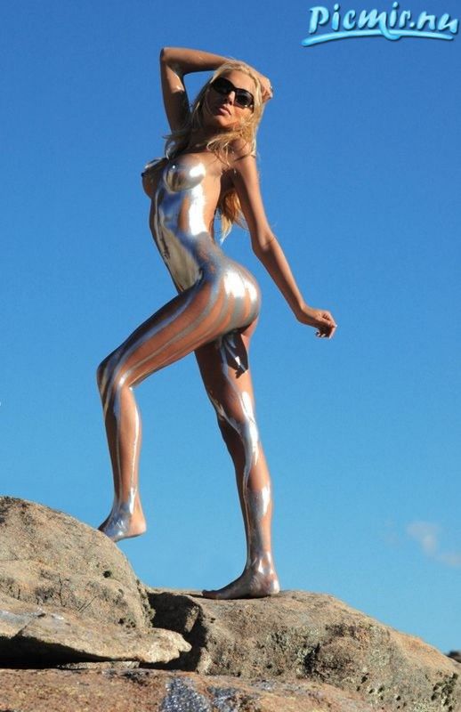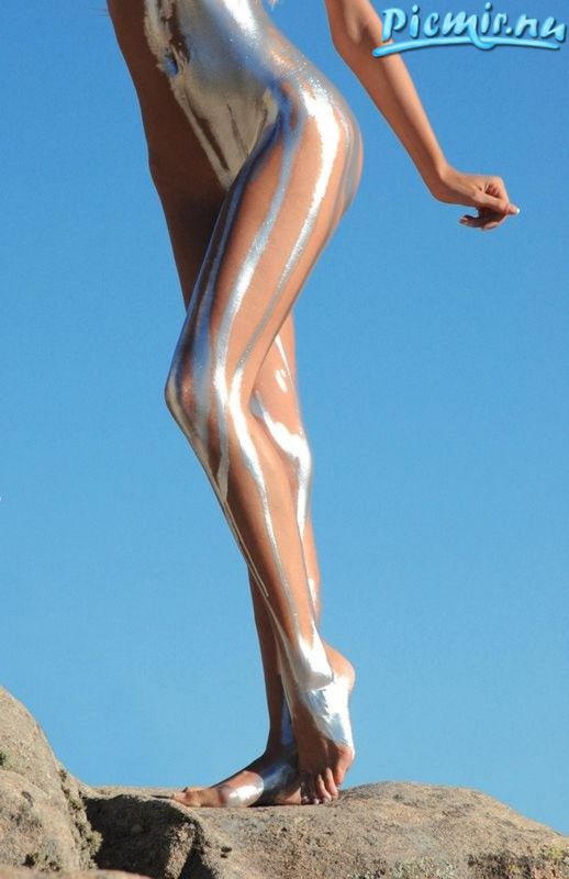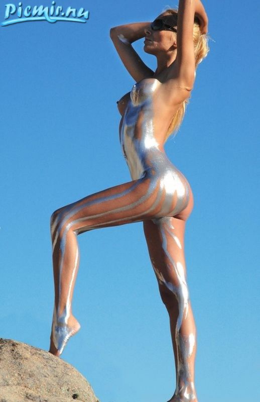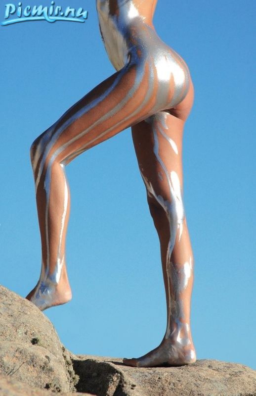 Стройная девушка раскрашенная серебряной краской позирует голая на природе