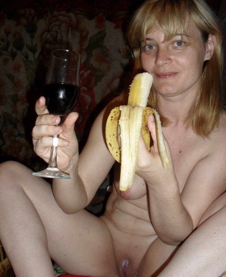Блондинка средних лет позирует на фоне ковра. С фужером вина, бананом и клубникой.