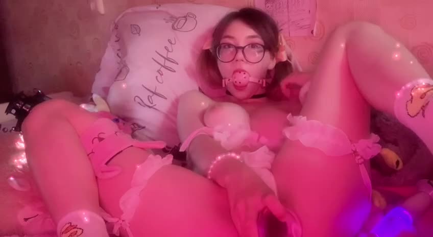 очкастая девушка шалит на кроватке развлекаясь со своими игрушками