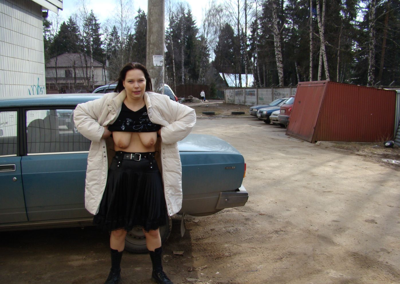 Смелая красотка. Мне кажется или 2107 самая сексуальная машина. Не первое фото уже попадается с голыми красавицами на улице, на фоне семёрок.