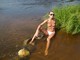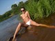 Красиво худенькая девушка позирует топлес на берегу речки!