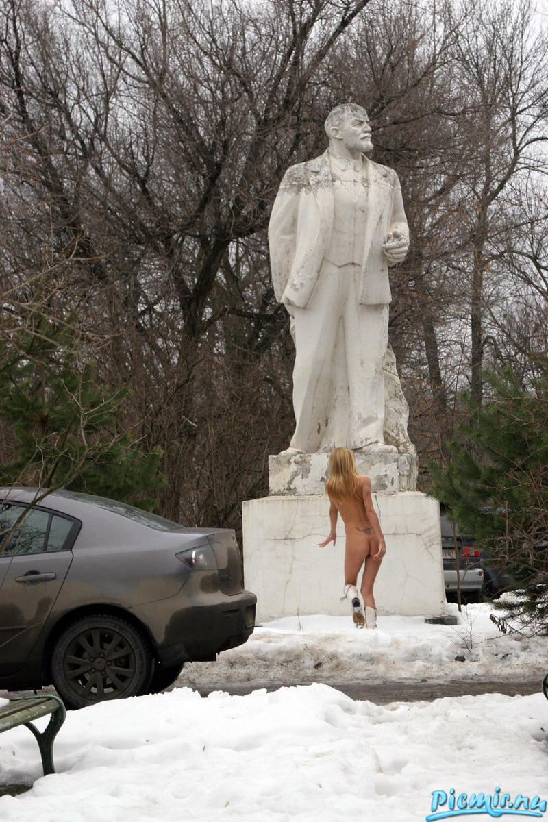 Стройная блондинка голяка гасает по зимнему скверику возле памятника Ленину. Где-то ему ещё памятники стоят...
