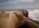 Красивая брюнетка, лежащая на береговых скалах, показывает себя на фоне моря, а таже несколько фотографий снятых дома.