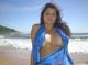 Красивая и яркая женщина гармонично вписывается в морской пейзаж.
