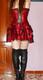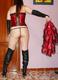 позирует в красно чёрном наряде