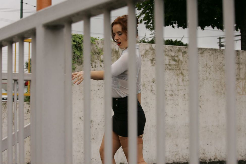 Симпатичная дама. Но так гулять она не пойдёт.Чулки юбка не закрывает.