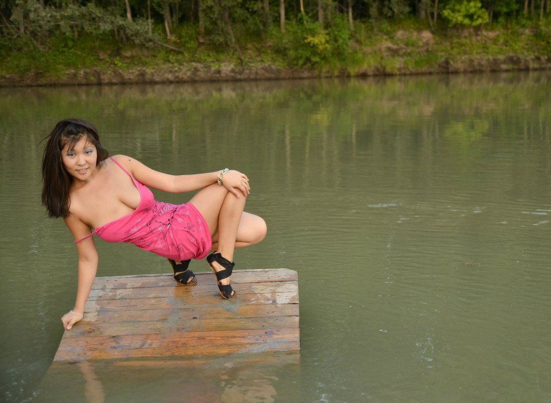 Прелестная азиатская девушка позирует на природе. Демонстрирует аппетитное тело и красивую грудь.