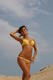 Шикарно позирует прекрасная брюнетка с загорелым телом в песках.