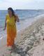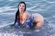 брюнетка позирует на берегу моря показывая свои большие груди и рабочие дырочки