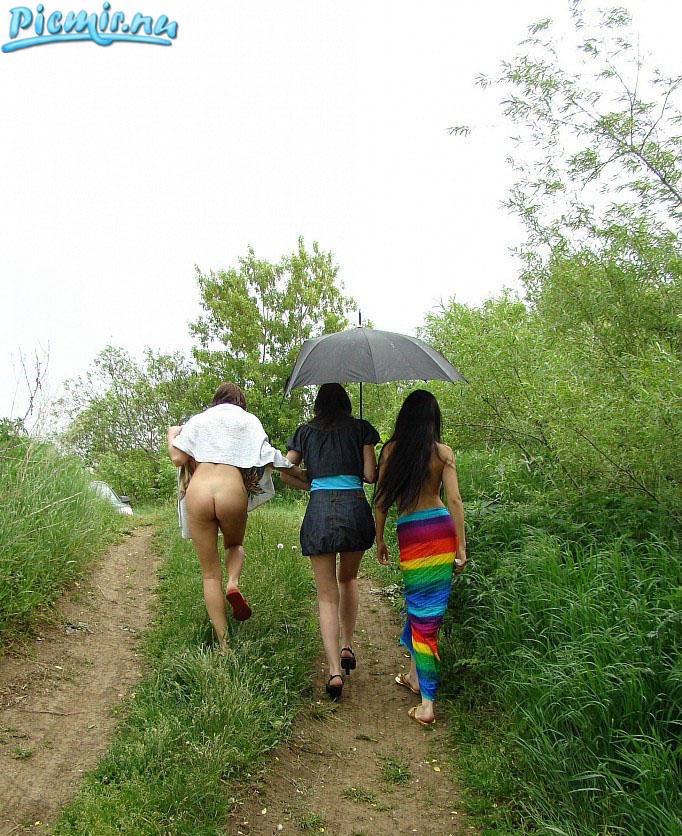 Три весёлые подружки позируют на фоне природы и малость прикалываются...