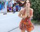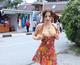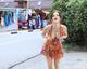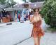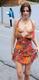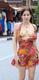 Девушка в красивом летнем платье показывает грудь на людях.