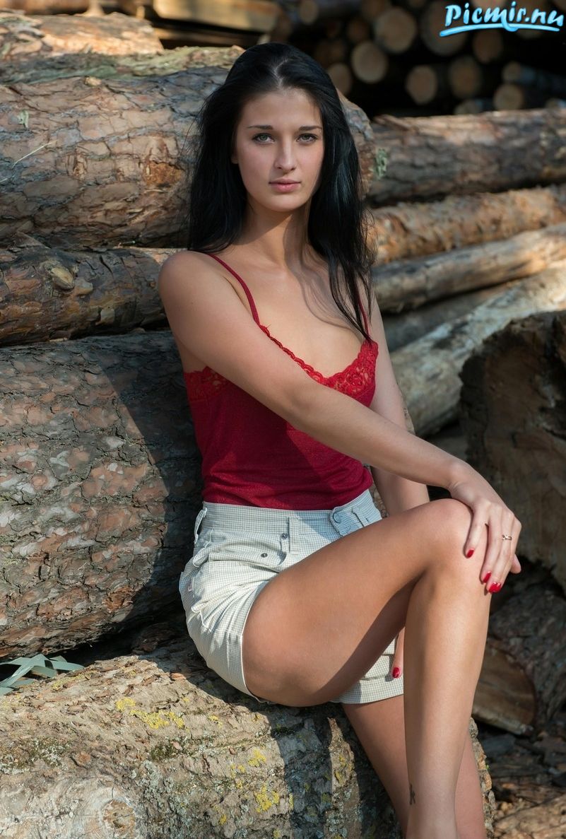 О, какая дивная прелестница красиво позирует на стволах вековых деревьев, как контраст, тонкая тростиночка брюнетка и мощный старый ствол!
