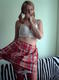 в белом нижнем белье, в красной юбке в клетку и в красных чулках