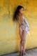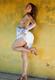 Симпатичная девочка у стены застенчиво демонстрирует свои прелести...