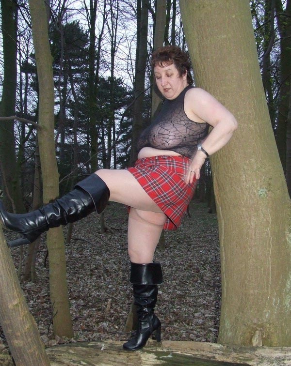 Аппетитная зрелая мадам прогуливается по лесу и заодно показывает свои сладкие прелести.