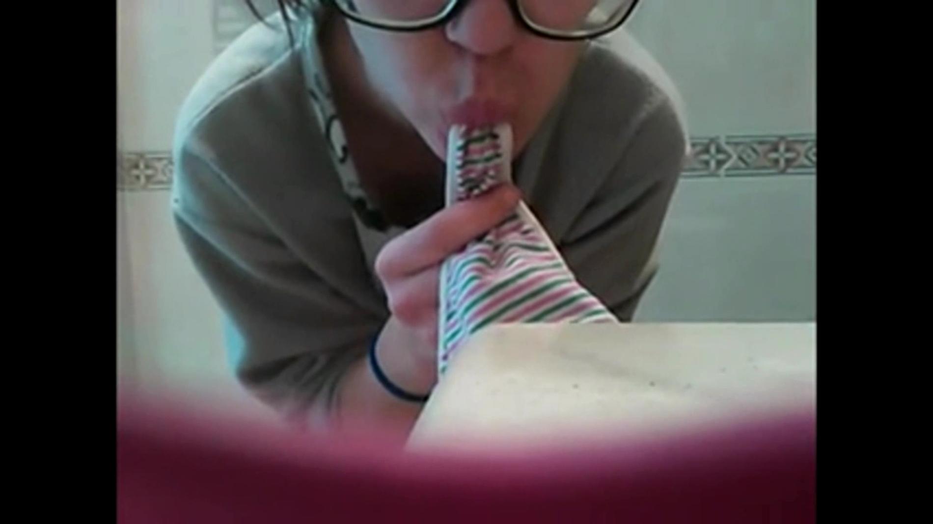 Молоденькая извращенка с удовольствием вылизывает свои трусишки.