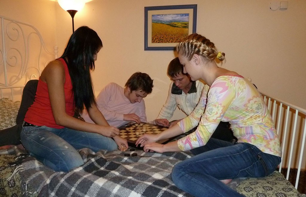 Две молодые пары решили сыграть в шашки, но как то у них это не заладилось, зато в групповушке преуспели просто замечательно.