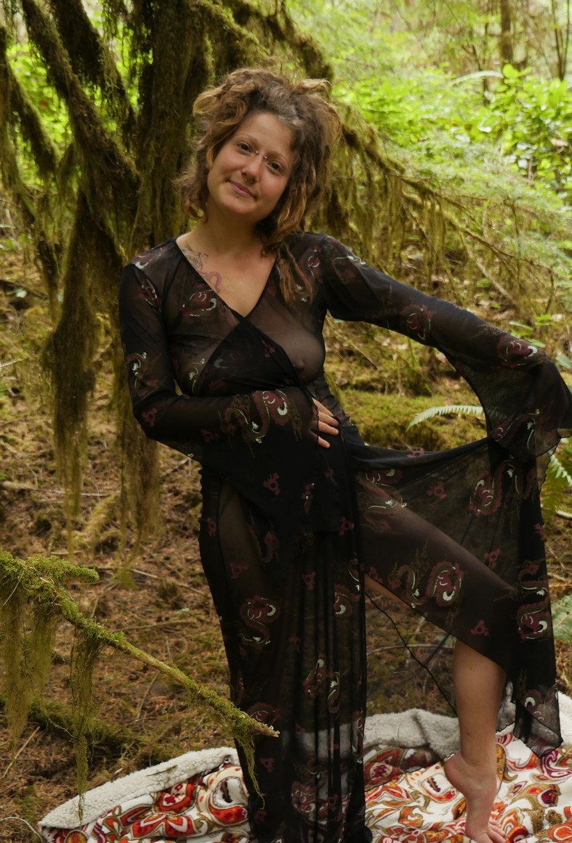 Брюнетка-хиппи с большими натуральными сиськами позирует обнаженной в диком лесу