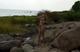 писает на берегу водоема усевшись на камень