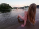 Красивая девушка возле старой деревянной пристани, к которой ещё причаливают катера и речные пароходики.