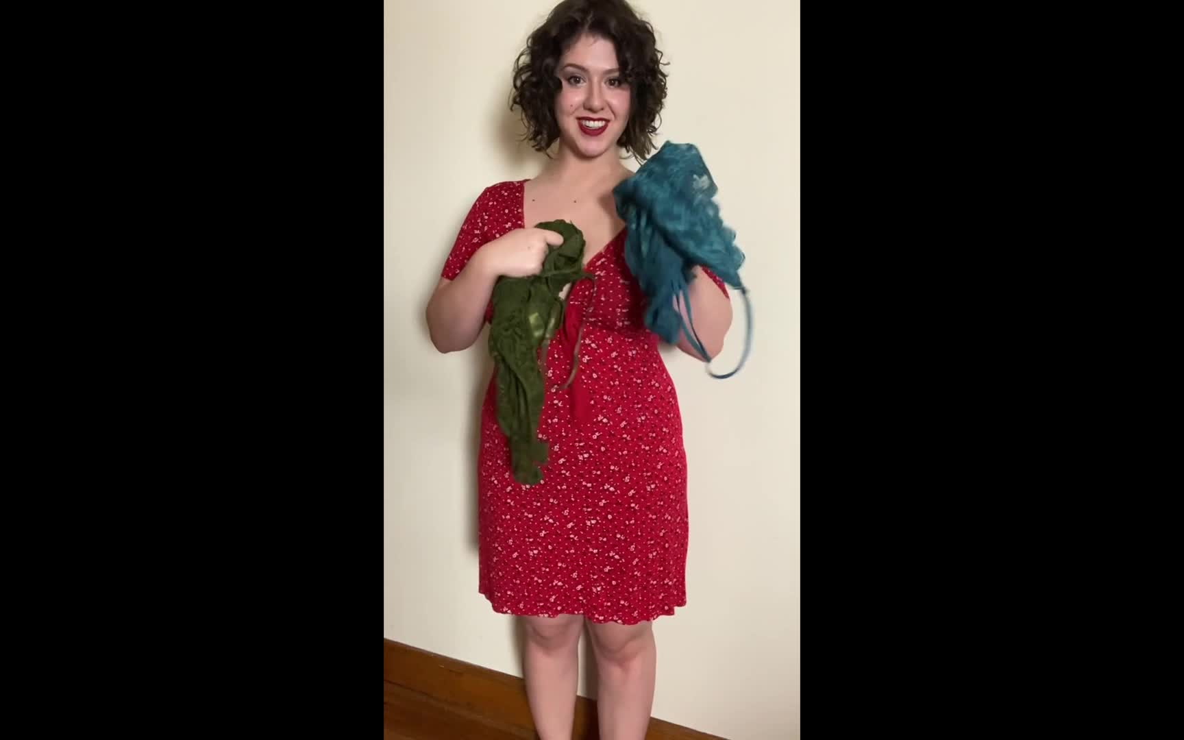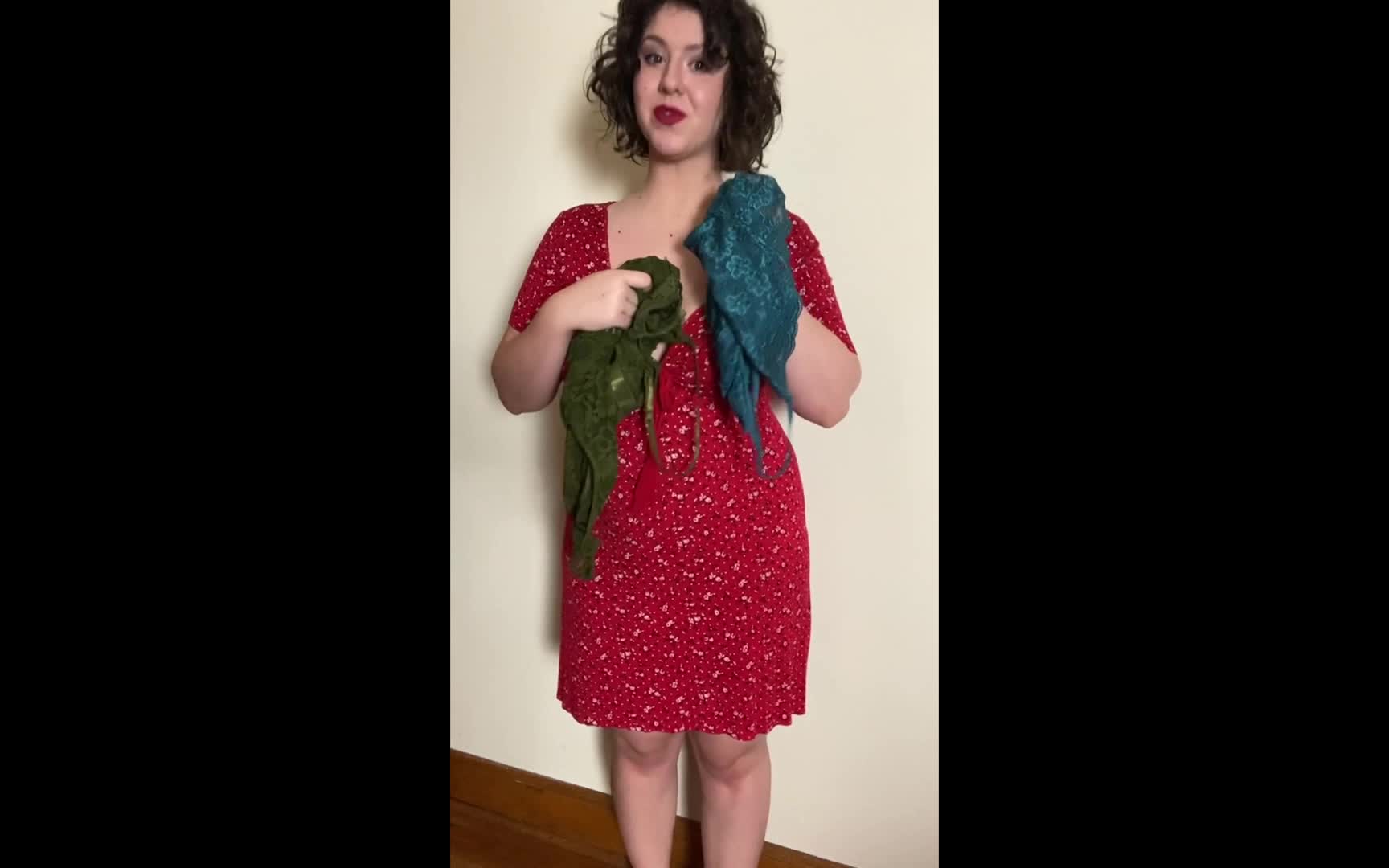 Красивая брюнетка предложила выбрать какого цвета одеть ей нижнее бельё, надела его и потом разделась.