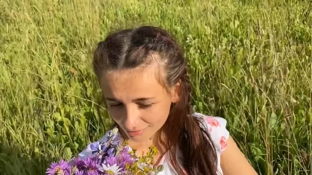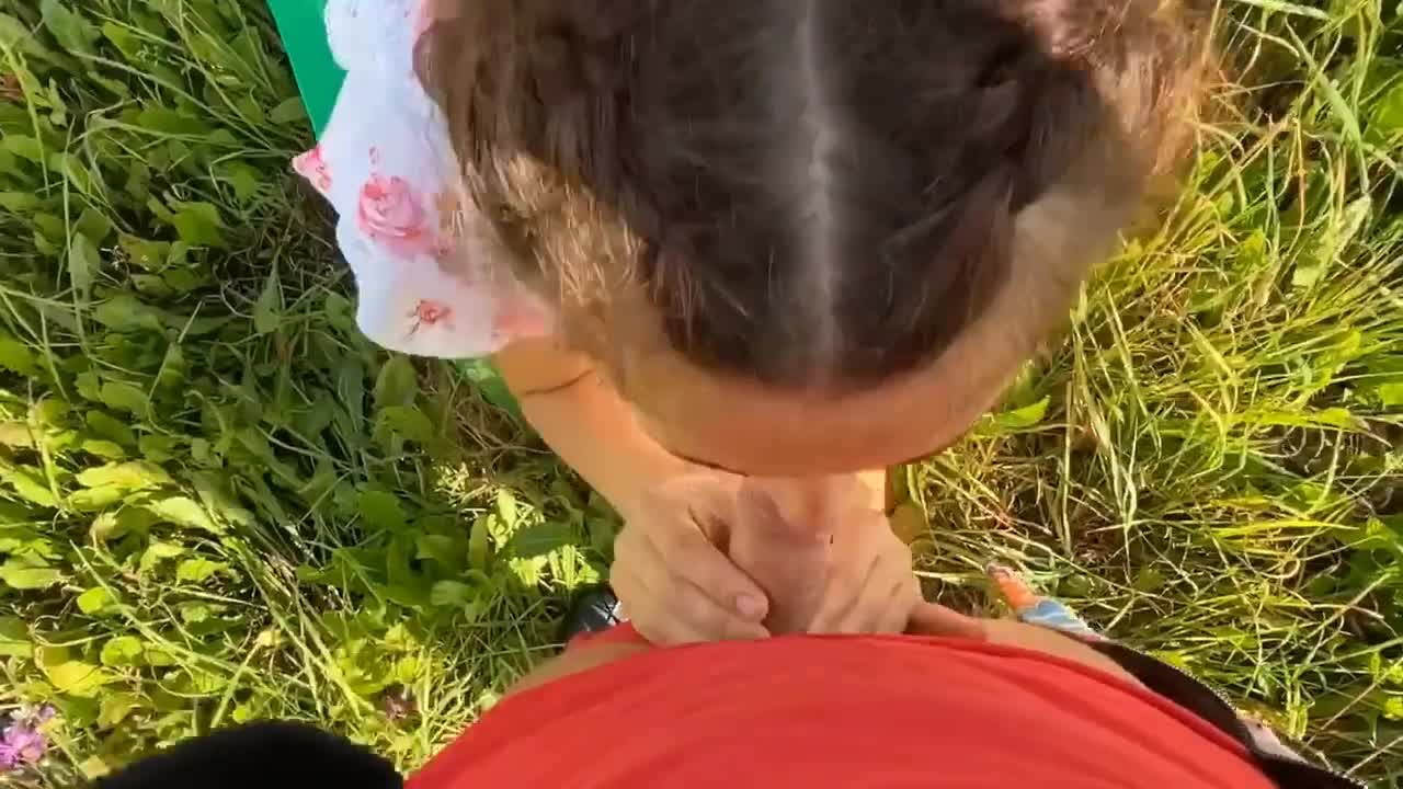 Девчонка в легком платьице и красных резиновых сапожках решила заняться сексом со своим парнем в поле, представляя себя крестьянкой. В благодарность за букет полевых цветов взяла в рот член друга и сделала ему минет на природе.