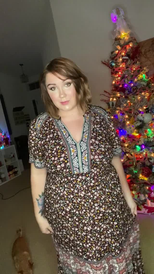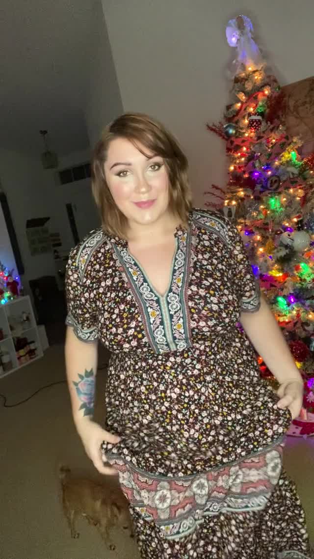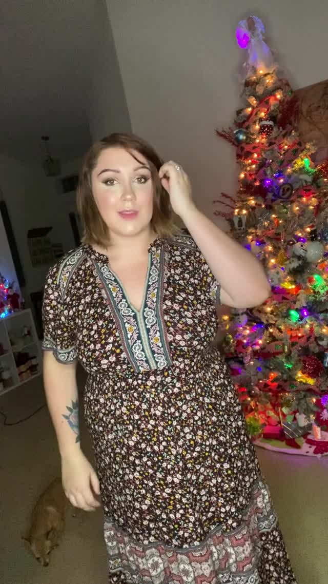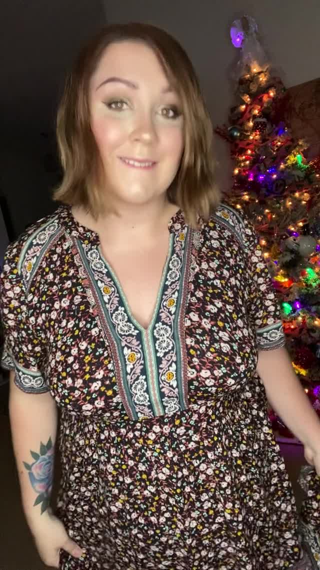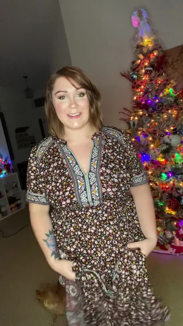 Красивая и милая женщина сделала поздравление для всех мужчин перед уже поставленной дома ёлкой.