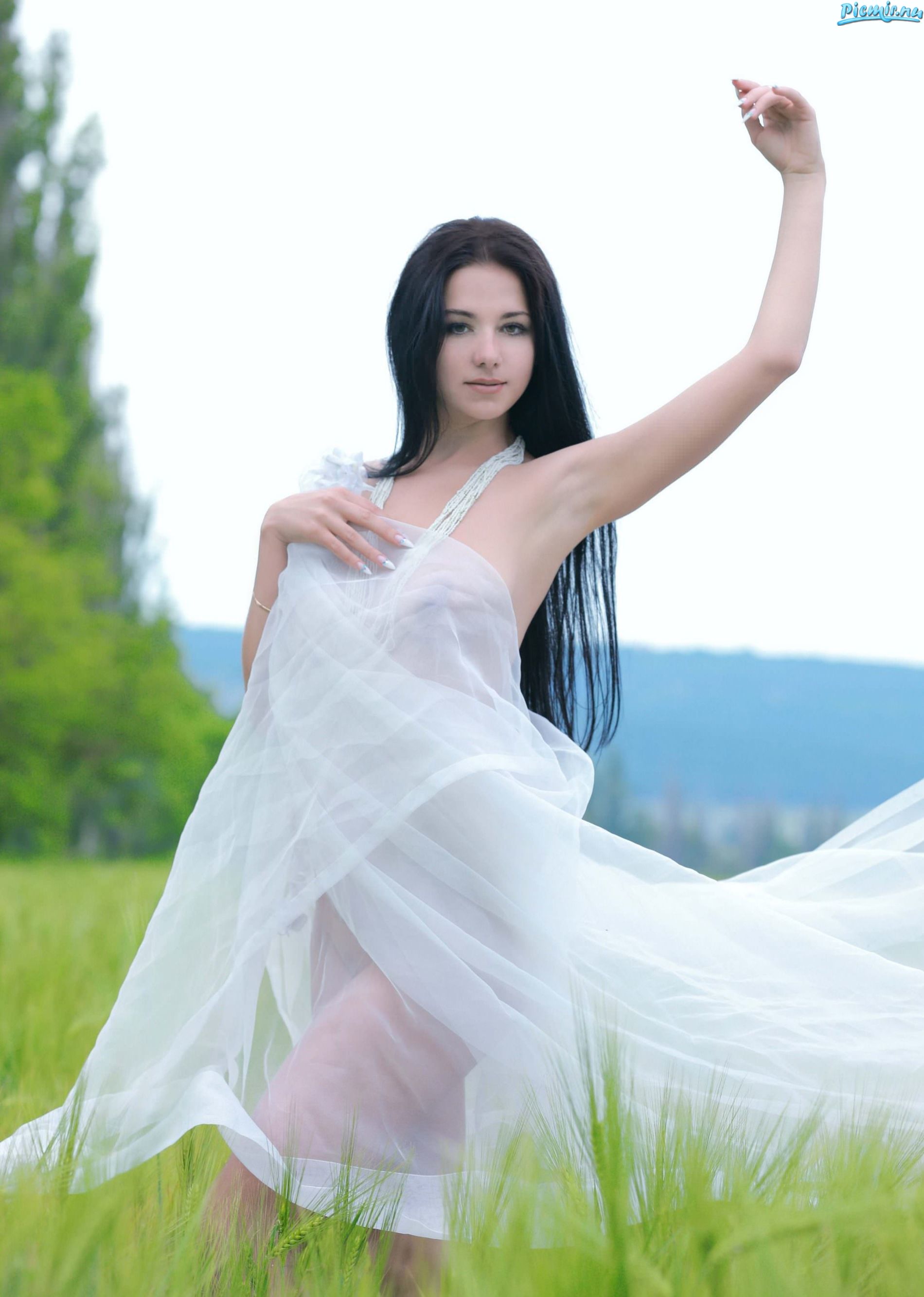 Брюнетка позирует в поле