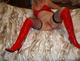 Прелестница облаченная в пеньюар, чулки и красные сапожки демонстрирует стриптиз на кровати.