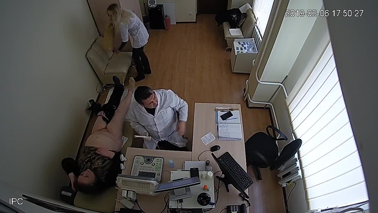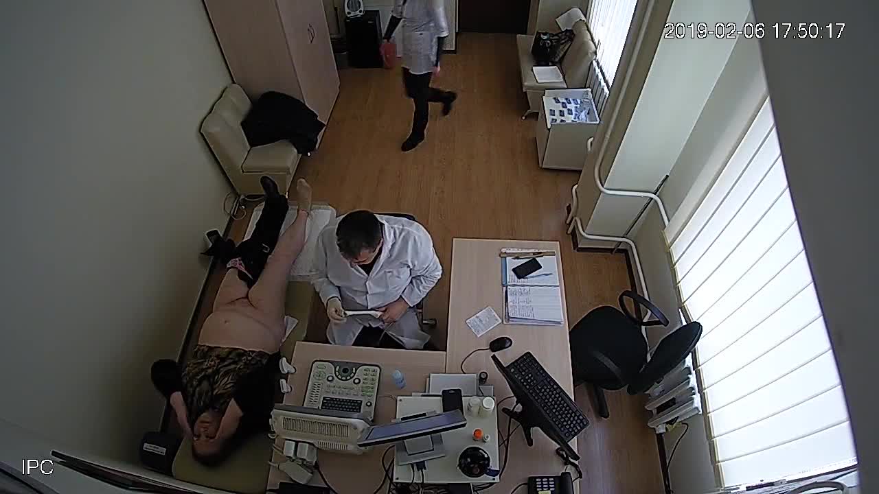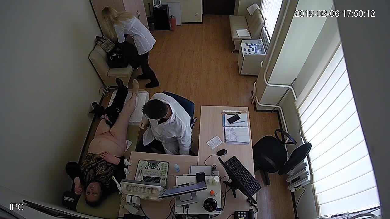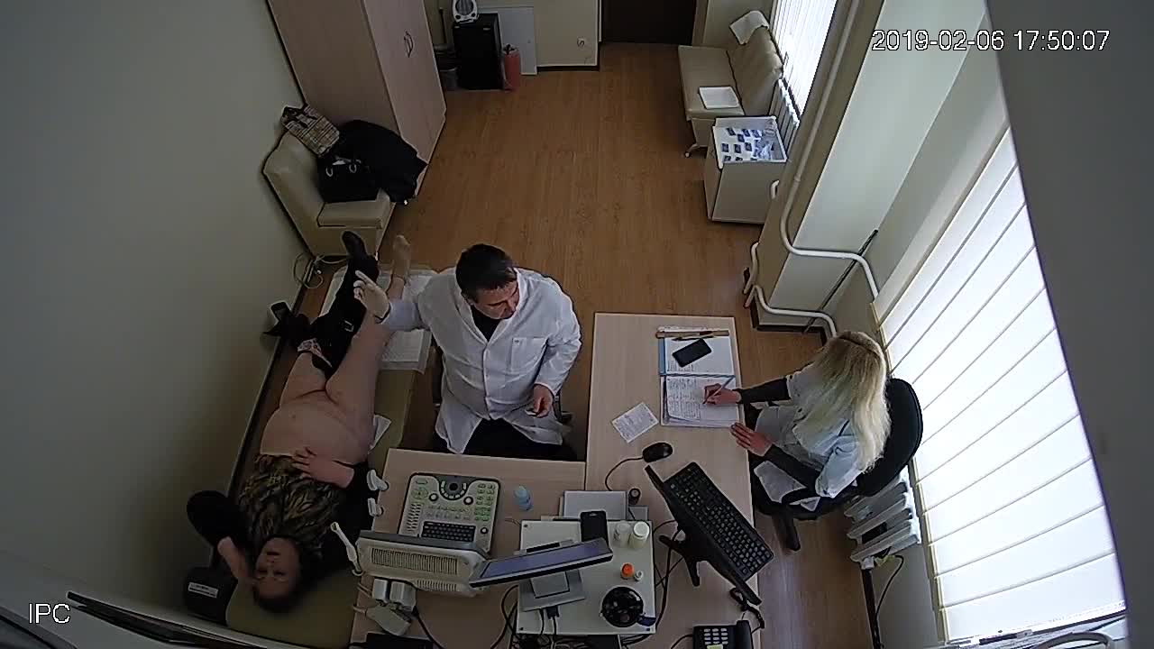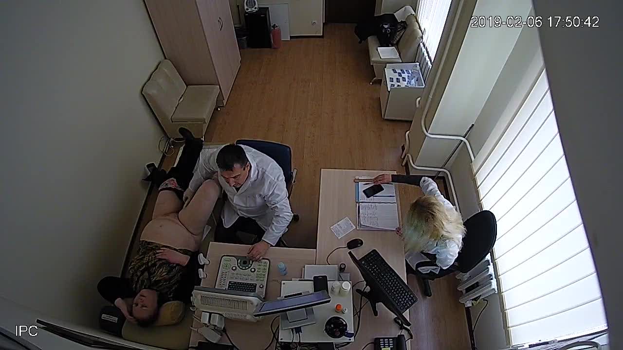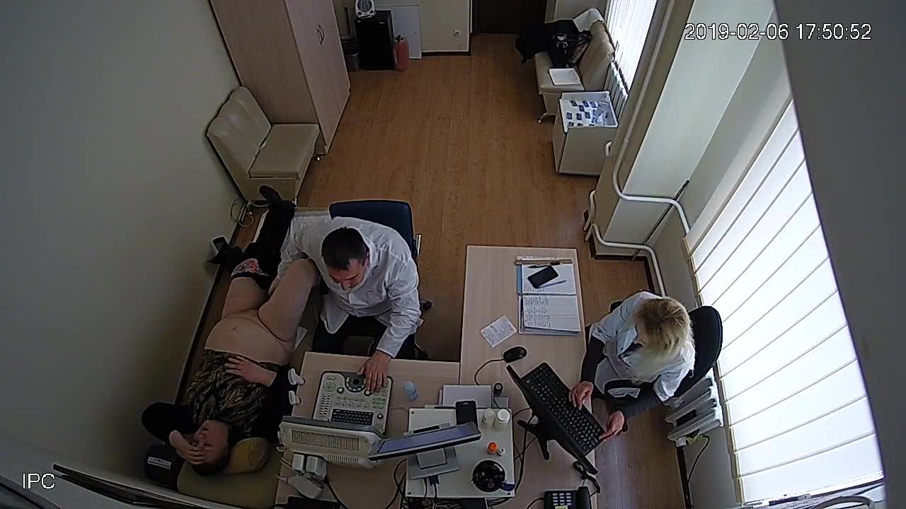 На обследовании врача зрелая полная женщина с большим животом.Доктор ловко вставляет ей во влагалище медицинский прибор.