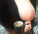 Женщина позирует обнажённой налитой грудью и кружкой кофе