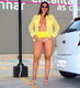 Женщина в яркой одежде разделась в автосалоне, показав свою сексуальную фигуру.