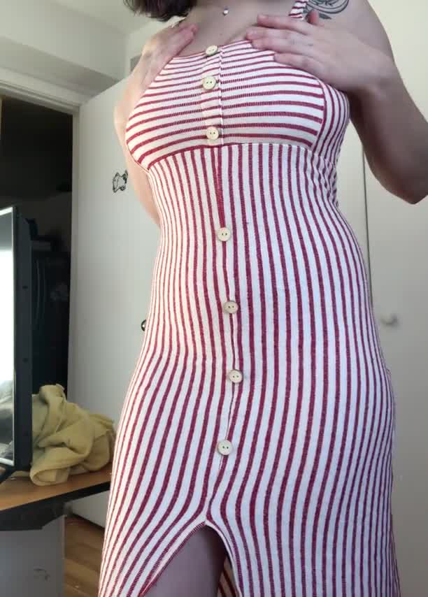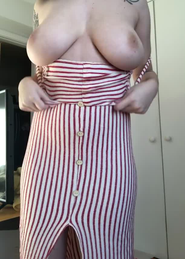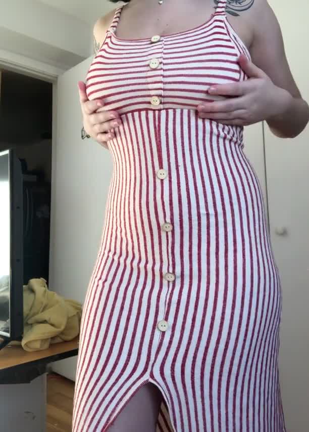 Чудесная девочка делится видом своей прекрасной груди, опуская верх платья.