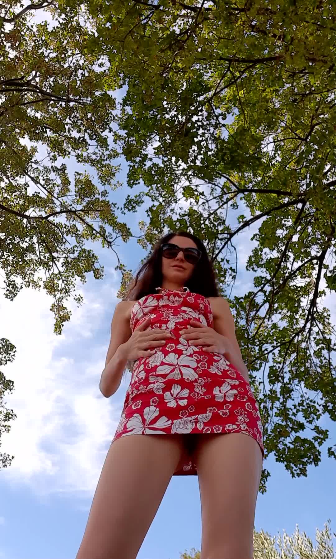 камера снизу а красивая девушка без трусиков сверху показывает на природе свою писю