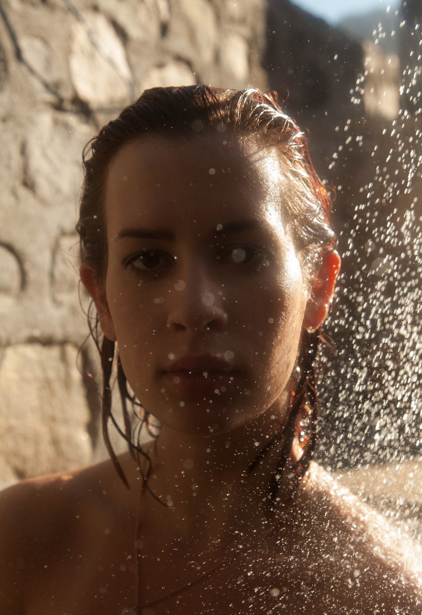 Грудастая красотка теряет снимает фиолетовое платье на улице и принимает душ