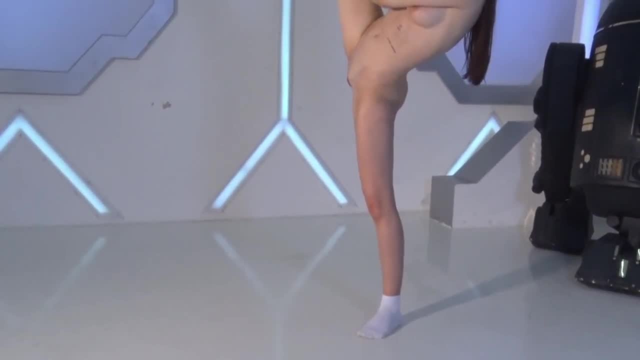 Молоденькая гимнастка, одетая в одни носочки делает растяжку