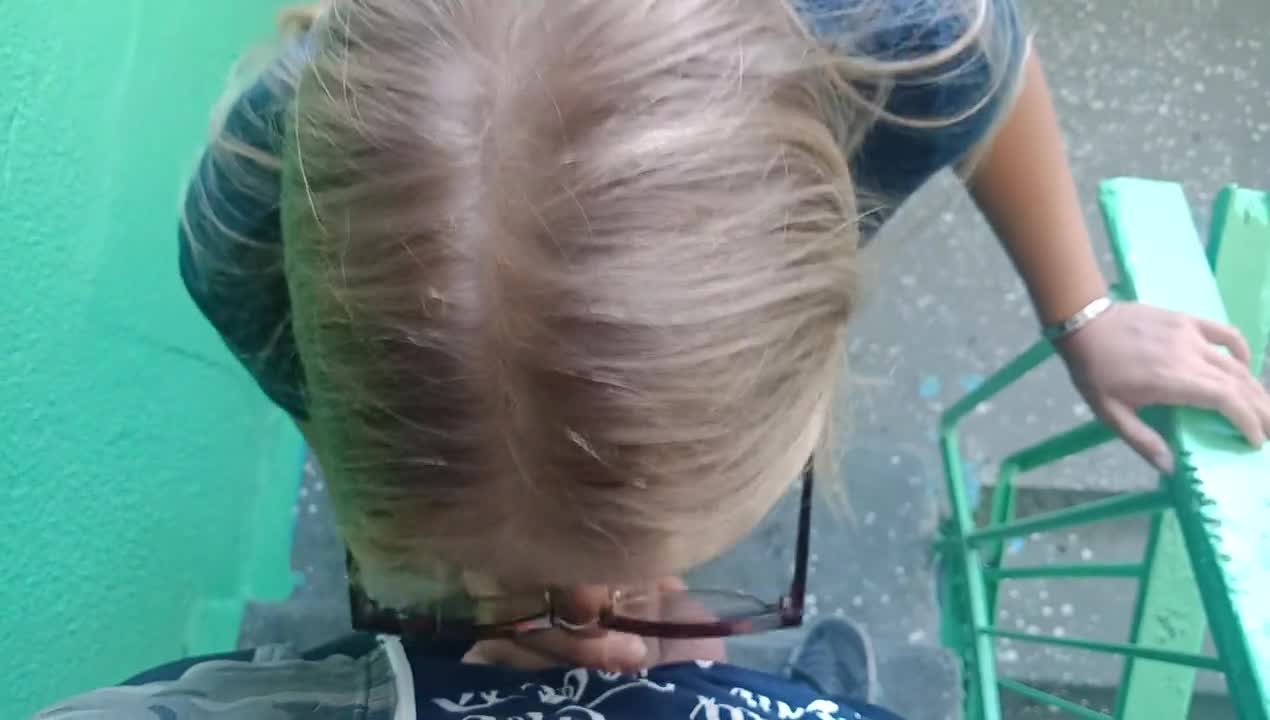 Девушка в очках сосёт член в подъезде и получает сперму на лицо